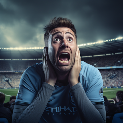 Tifosi Citizens euforici per il dominio sul campo… ma cresce l’ansia in attesa delle decisioni sulle presunte infrazioni del fair play finanziario. L’immagine: mani sulle orecchie e sorriso teso… la paura di un “caso Everton” è reale!