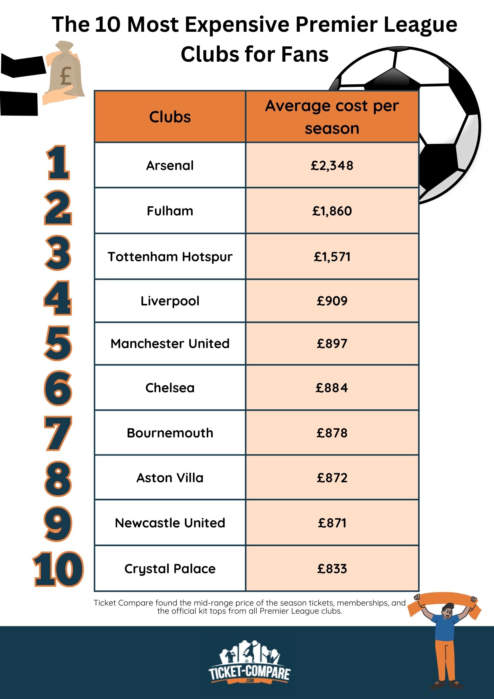 I tifosi dei Crystal Palace affrontano il costo più basso in questa classifica, ma resta tutt’altro che economico. La voce più cara è l’abbonamento stagionale: $995 (in aumento del 5%). Nonostante il rincaro, il club ha registrato un record di rinnovi per la stagione 2023-24.